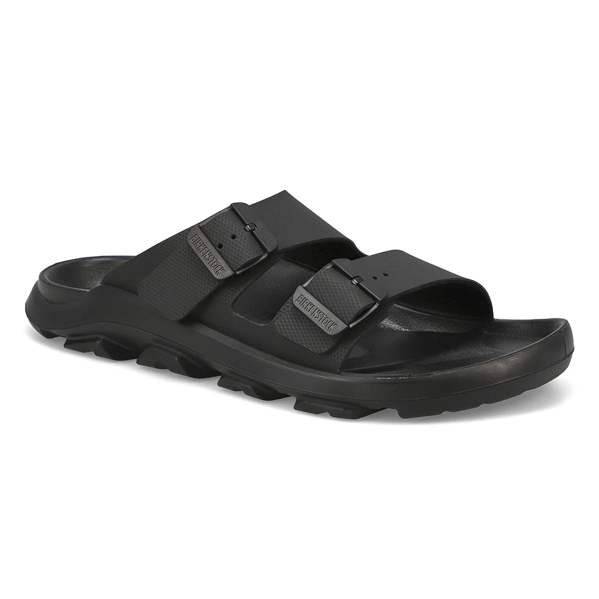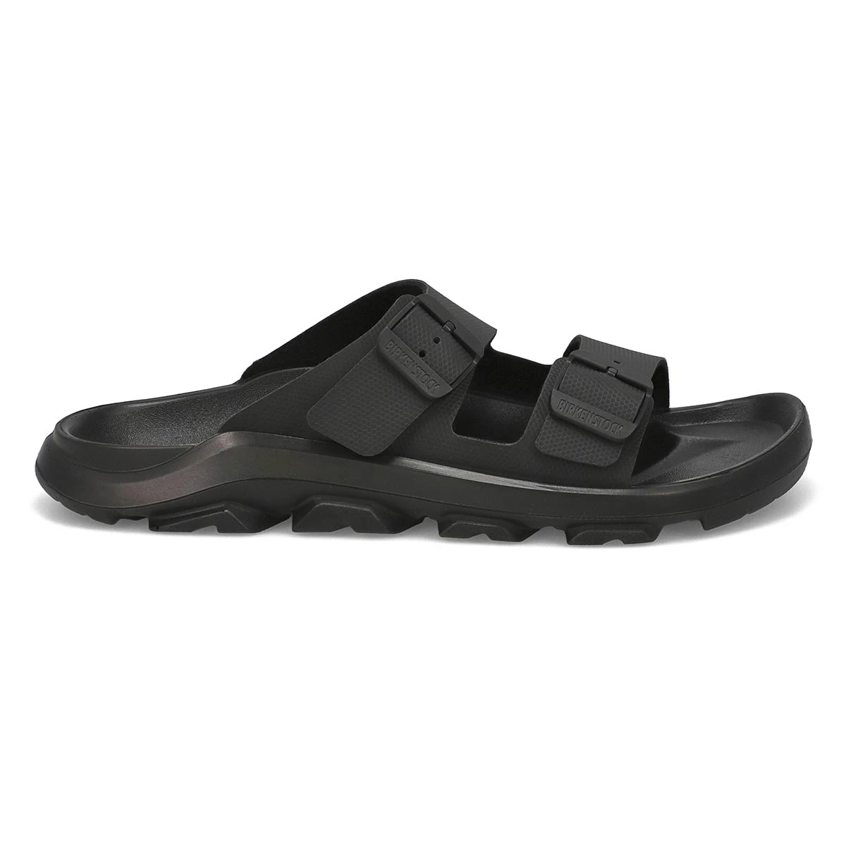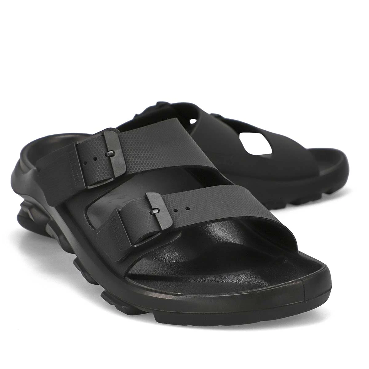 The Mogami Terra black Birko-Flor sandal from Birkenstock is the perfect match for adventures of any kind thanks to the water-resistant footbed with toe protection and the highly functional sole which is injected into the footbed and upper in two layers. This makes the sandal extremely flexible and durable in any terrain. The polyurethane sole is affixed to the footbed in two layers and therefore offers maximum flexibility, grip, and durability. This version has two straps featuring the modern and functional Birkenstock stealth buckle. Made from a stainless synthetic material, this buckle is not only durable, but also boasts minimalist design. The upper is made from the skin-friendly, hard-wearing synthetic material Birko-Flor. Made in Germany.