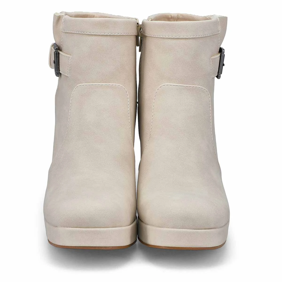 The Bree Platform cream buckle bootie from SoftMoc is designed with a soft tumbled faux leather upper and is the perfect boot choice whether your outfit is demanding a dressed up look or weekend casual. Fearuring a cushioned footbed to help create all day comfort. The Bree boot is designed with a durable rubber outsole.