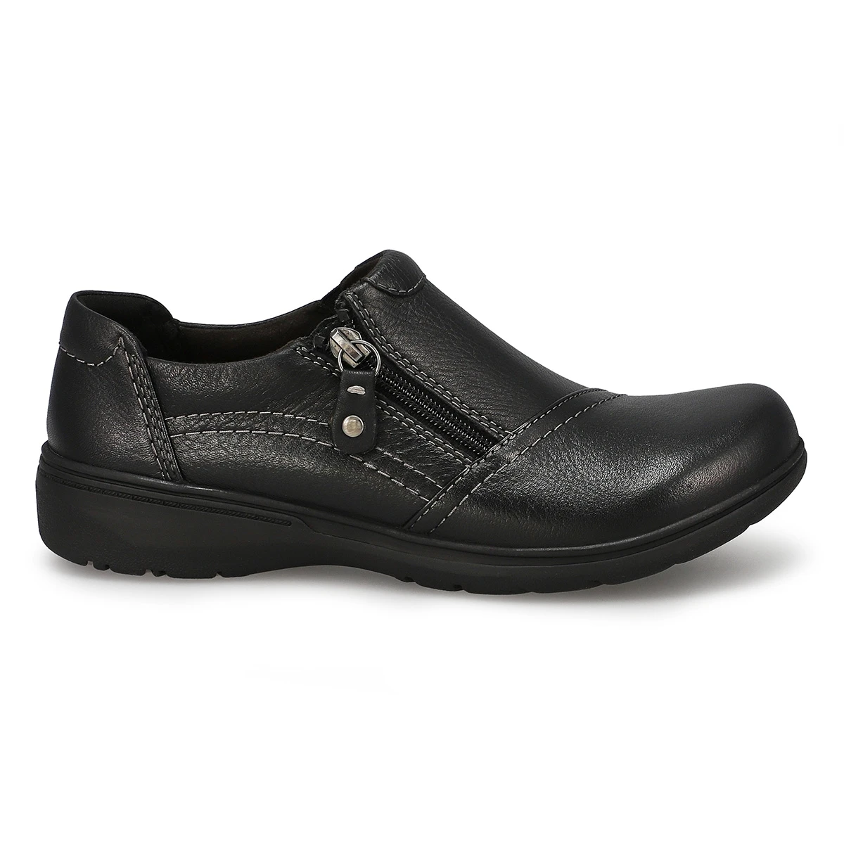 Keeping comfort at its core, Clarks trusty everyday shoe, the Carleigh Ray wide casual shoe that is crafted for back-to-work and busy weekend wear. Durable combination suede and leather uppers in classic black wrap the foot perfectly, while our signature underfoot cushioning and a super-grippy sole keep every step grounded. Wide Width
