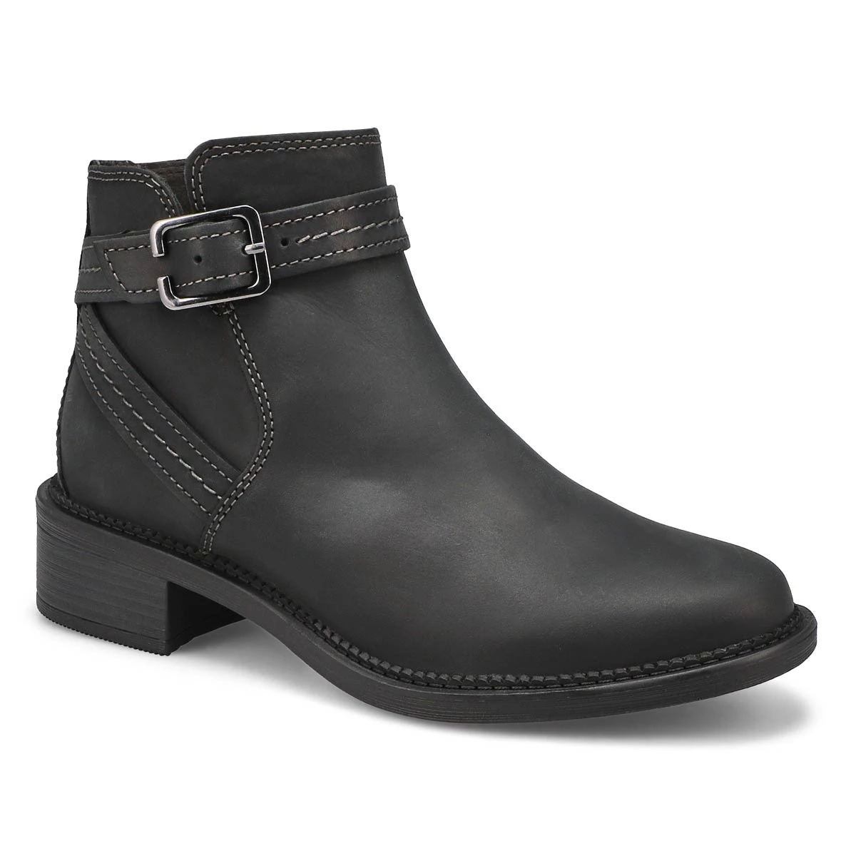 Get the stylish Maye Strap black ankle boot from Clarks and stay on top of the fashion game. Featuring a beautiful suede upper with a breathable textile lining and insole. OrthoLite footbed enhances comfort while reducing impact. Zippered side closure for an easier on and off. Synthetic outsole with high traction and durability.