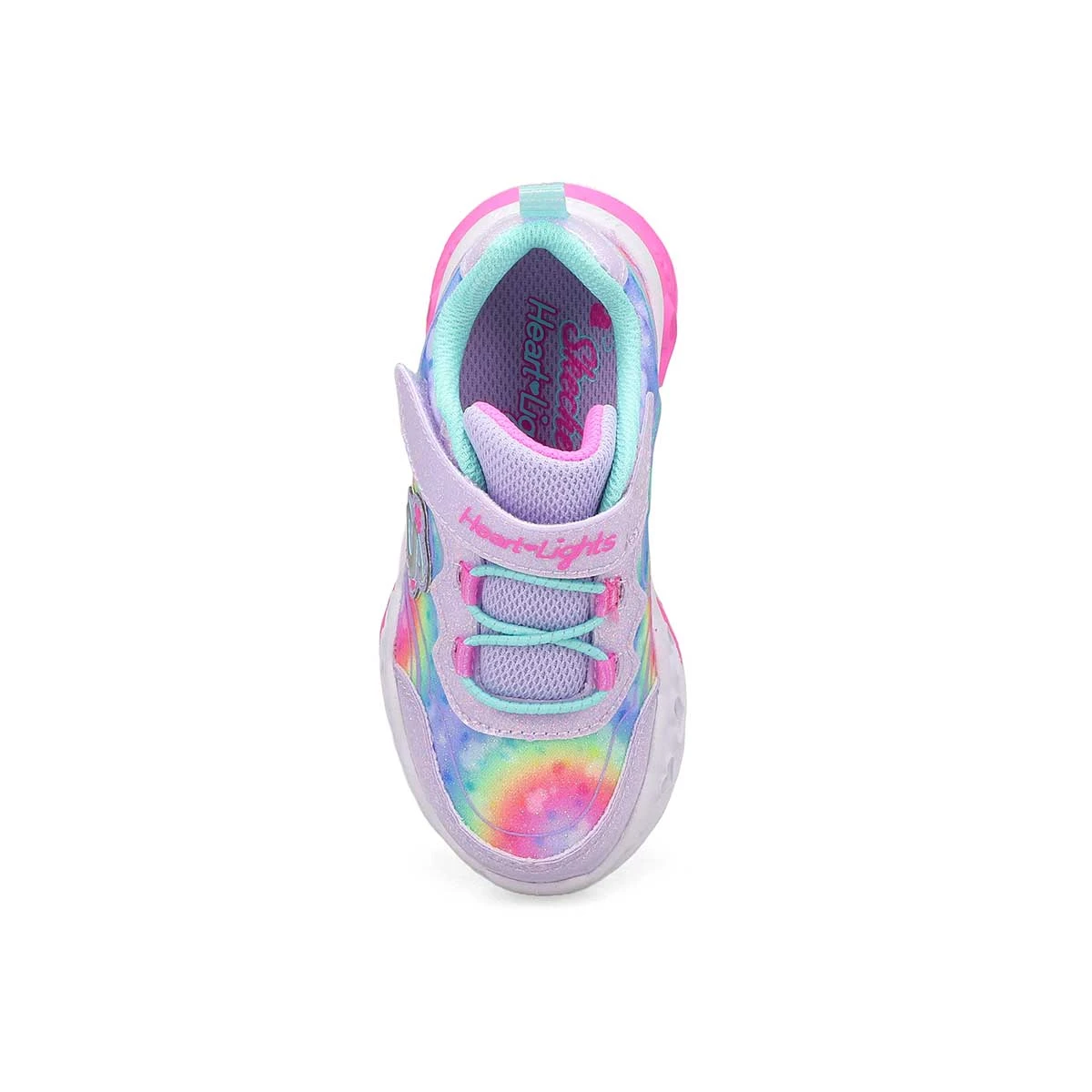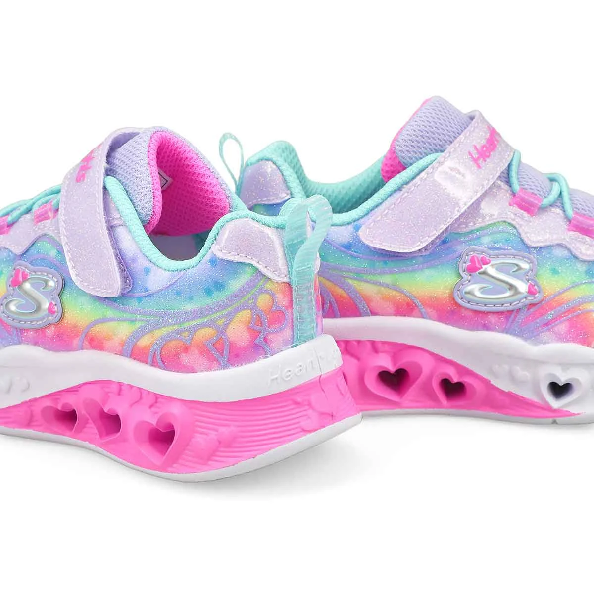 Illuminate your style with feet-loving comfort in Flutter Heart Lights lavender/ aqua sneaker from Skechers. This lightweight slip-on features a multicolor leopard print fabric and glittery synthetic upper with a fun 3-D heart-sculpted light-up midsole. Slip-on style with instep strap and stretch laces. Bigger kids’ sizes feature on/off light switch.