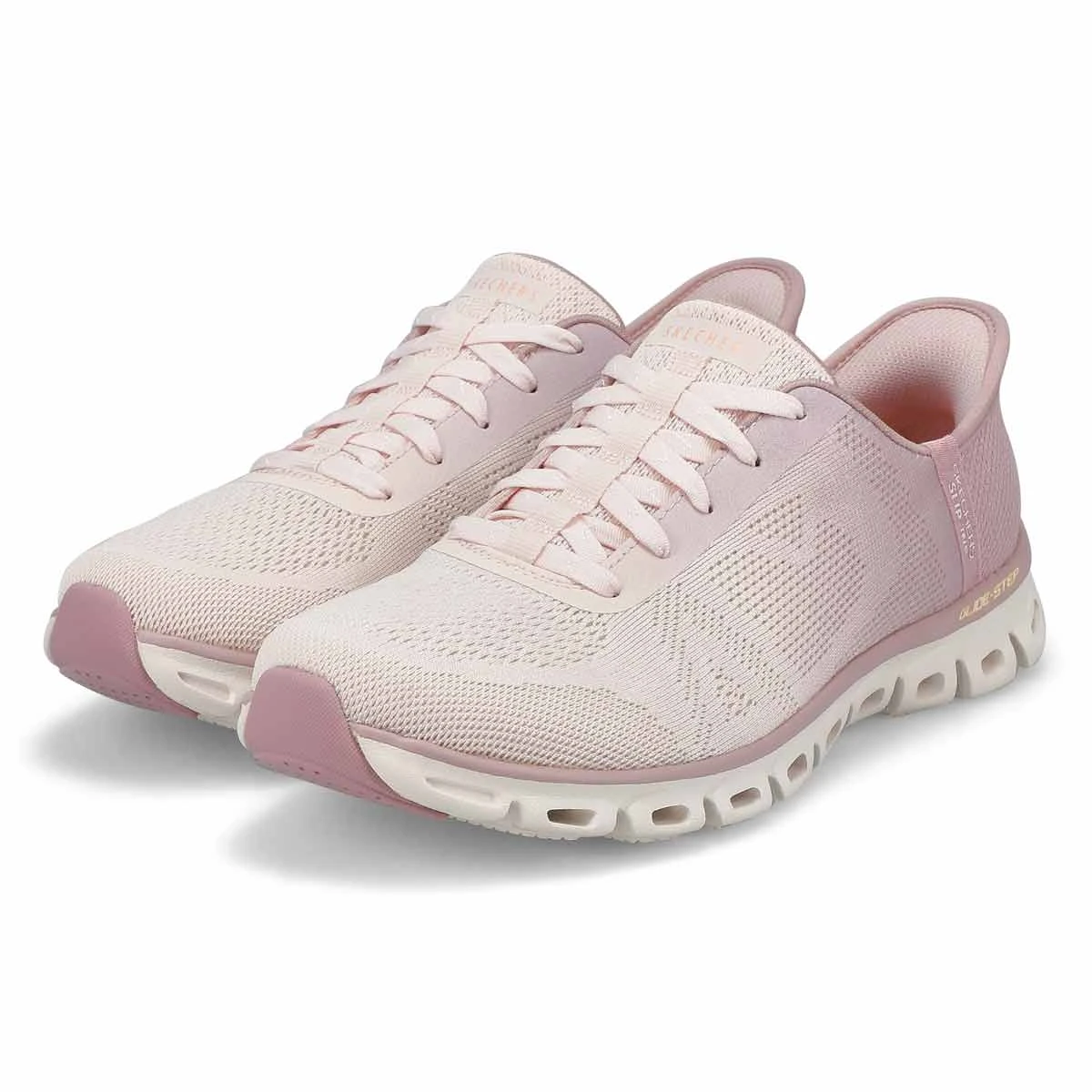 Simply step into flexible comfort wearing the Hands Free Slip-ins Glide Step Excite mauve sneaker from Skechers. Designed with Skechers exclusive Heel Pillow. this stretch-laced style features a mesh upper with synthetic hotmelt overlays, a Skechers Air-Cooled Memory Foam comfort insole and a Glide-Step geometric cushioned midsole. Crafted with 100% vegan materials.