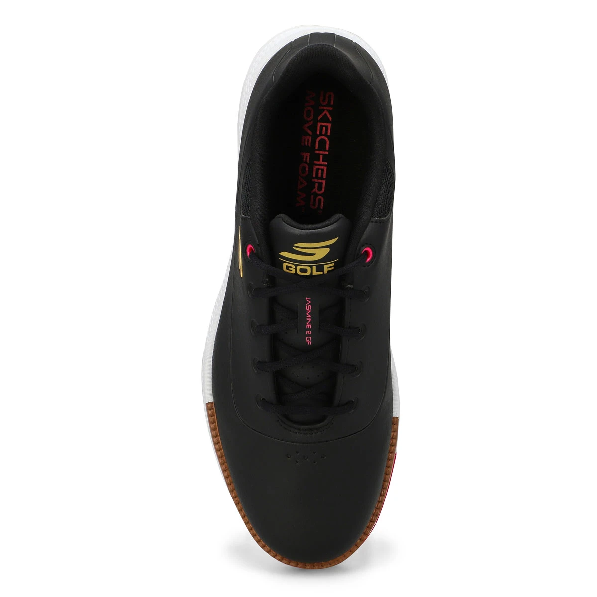 Put on your best game with Skechers GO GOLF Jasmine 2 GF black/ pink lace up golf shoe. This waterproof lace-up features a synthetic upper with a Move Foam comfort insole and earth-friendly ECO FLIGHT cushioning , plus a GRIPFLEX spikeless outsole provides superior traction and stability. Skechers GO GOLF logo detail.