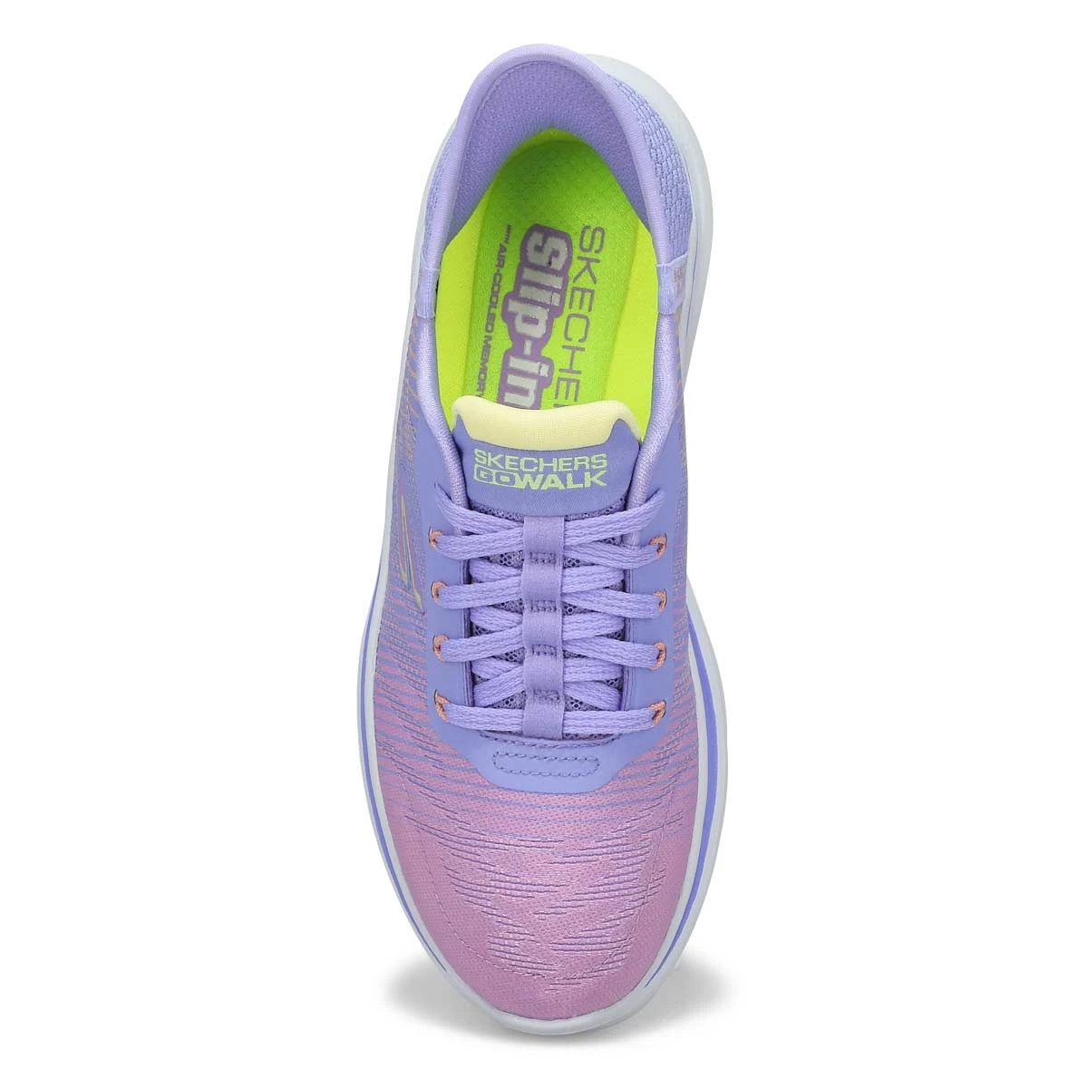 Walk in easy-wearing comfort with Skechers Hands Free Slip-ins GO WALK 7 lavender/ multi sneaker from Skechers. Designed with Skechers exclusive Heel Pillow holds your foot securely in place. This hands-free walking slip-on features an engineered mesh upper with a laced front, Skechers Air-Cooled Memory Foam insole, lightweight ULTRA GO cushioning, and high-rebound Hyper Pillars for added support.
