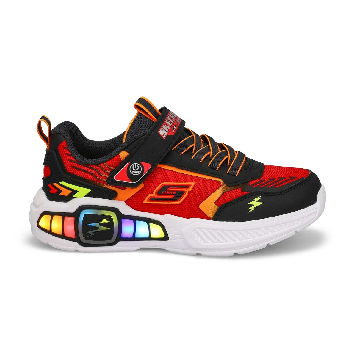 Step with a bolt of comfort and sporty style in Skechers S-Lights: Light Storm 3.0 black / red sneaker. This thematic sneaker features a mesh and synthetic upper with a multicolored light-up tech piece midsole, stretch laces, and adjustable instep strap. Shock-absorbing cushioned midsole with multi-colored lights. On/off light value.