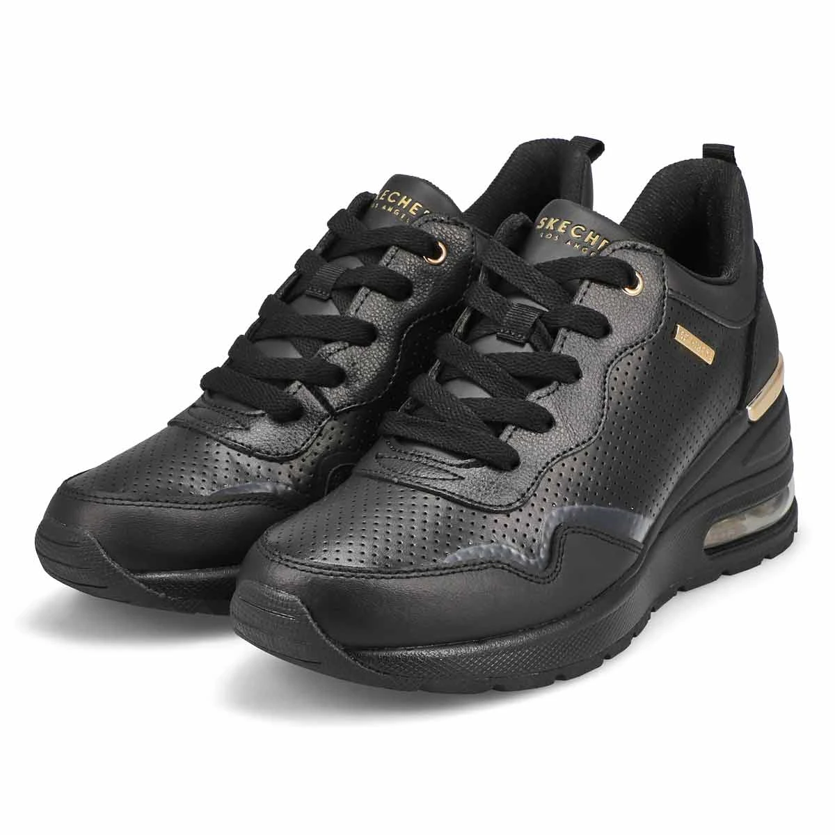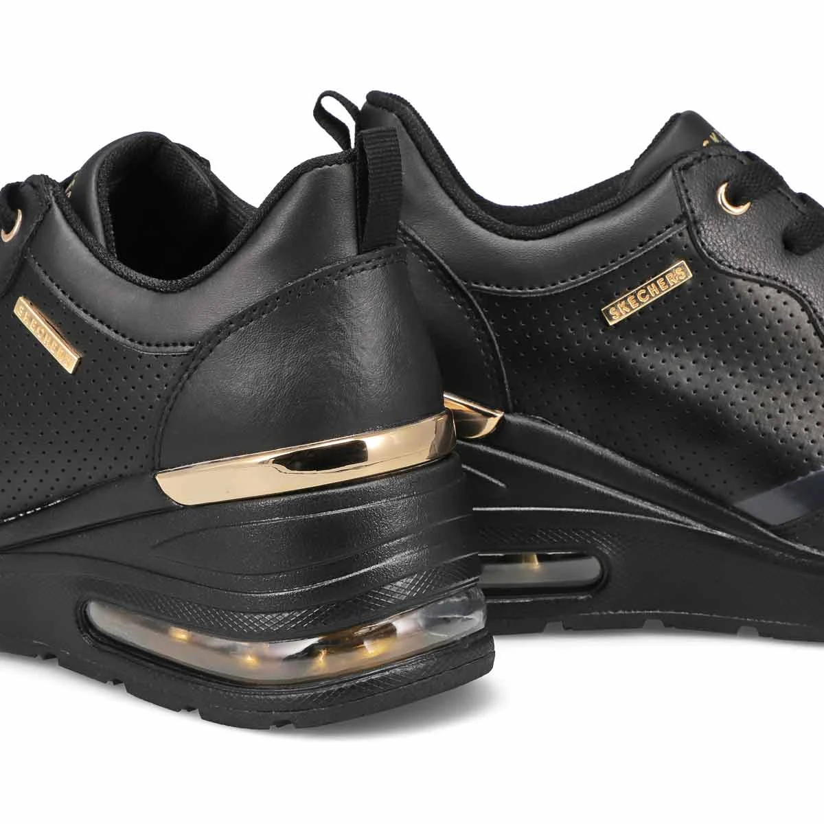 Boost your style with airy comfort in the Million Air – Elevated Air black lace up sneaker from Skechers. This lace-up wedge fashion sneaker features a synthetic durabuck upper with a Skechers Air-Cooled Memory Foam insole and a visible Skech-Air midsole. The Million Air Lace Up Sneaker is designed with a 2 1/2-inch heel height.