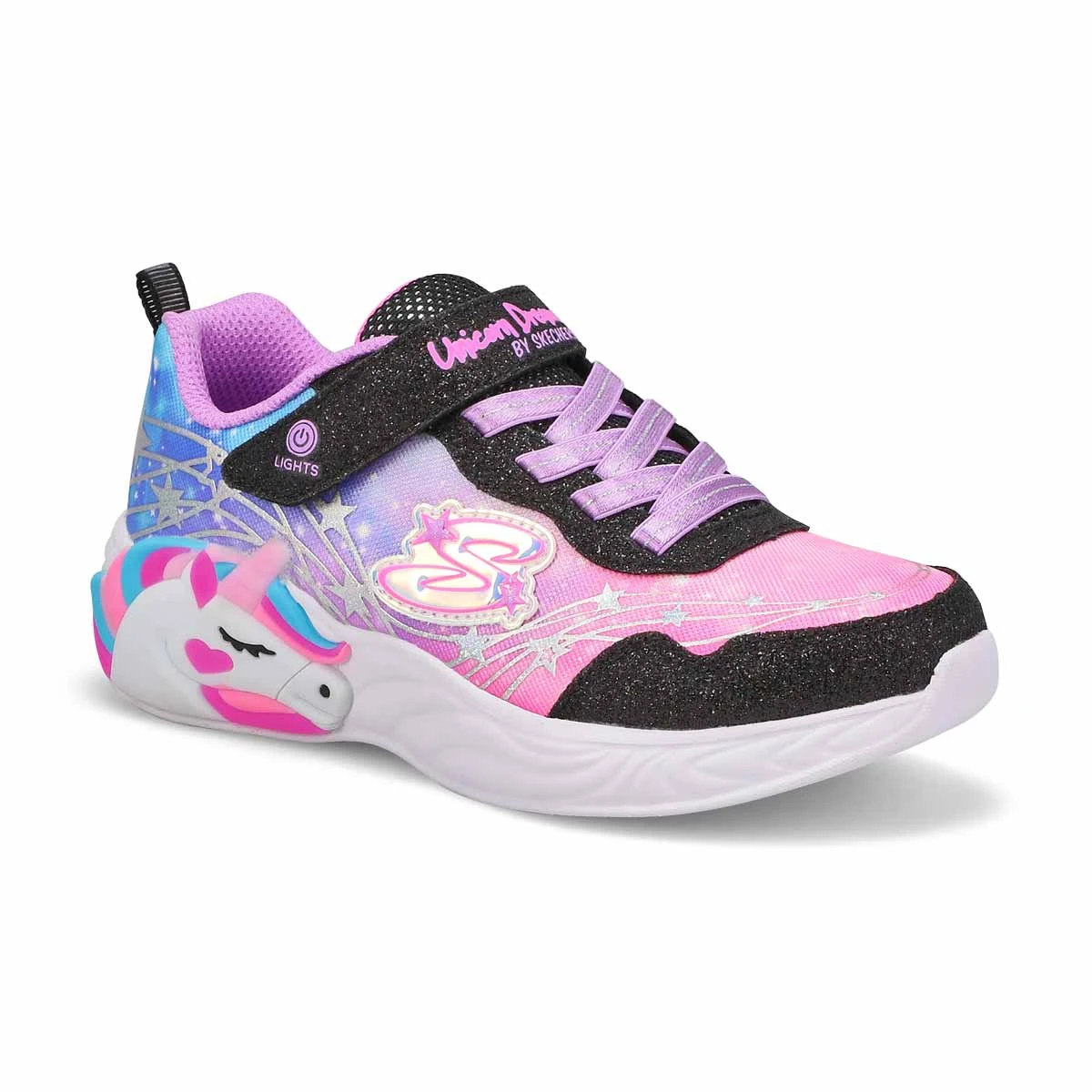 Brighten up their steps with a little unicorn magic in Unicorn Dreams black/ multi sneaker from Skechers. This light-up design features an ombre sheen mesh upper with star foil print, a light-up sculpted unicorn midsole and a cushioned comfort insole. Satin stretch-lace front and adjustable instep strap for a secure fit.