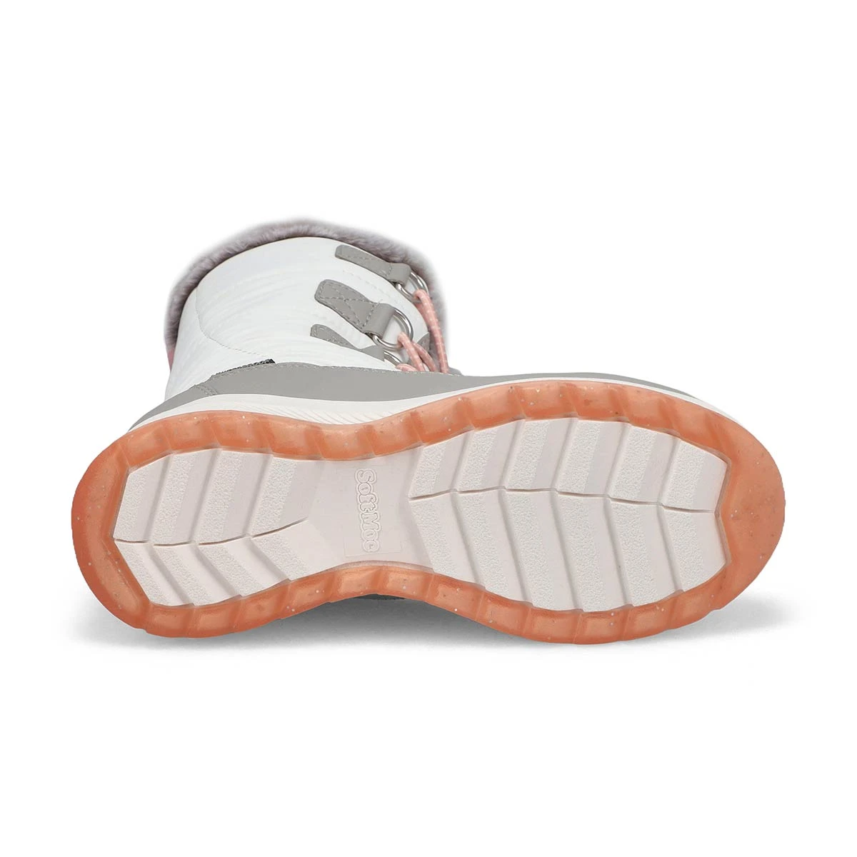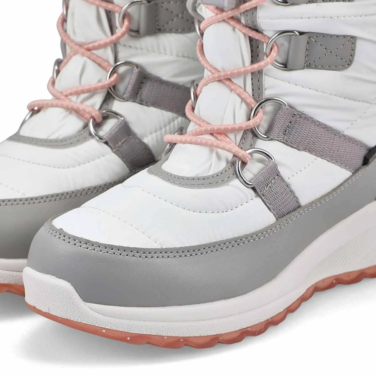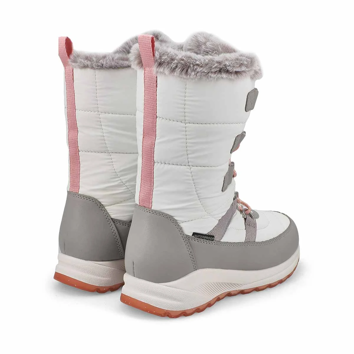 The Selena white waterproof boot from SoftMoc featurers a waterproof nylon upper with soft, faux fur collar and polar plush lining. Slip resistant traction outsole. Themolight insulation , built with lightweight construction in mind. You will want to make the Selena white waterproof winter boot part of your little one’s must-have list for this season!