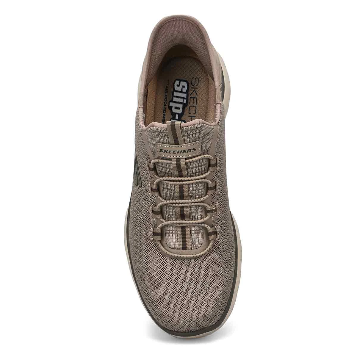 Take your sporty style to the next level with the Skechers Hands Free Slip-Ins Summits – High Range taupe sneakers. Made of mesh upper, these vegan-friendly sneakers have a round toe and bungee lace front for snug fit. The Skechers Hands Free Slip-Ins offers an easy fit, while the exclusive Heel Pillow holds your foot securely in place. Features include smooth textile lining, Skechers Air-Cooled Memory Foam footbed for all-day cushioning comfort, lightweight EVA midsole, and a flexible traction EVA outsole. Plus, these sneakers are machine-washable for easy maintenance.
